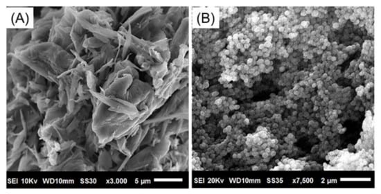 The morphology of AOC and AOC-NE3 were scanned using the SEM. It is noticeable that there is a large discrepancy between the SEM micrographs of AOC and AOC-NE3 (Figure 3). As can be seen in Figure 3A, the surface of AOC exhibited interconnected flake-like shapes. On the other hand, the SEM micrograph of AOC-NE3 (Figure 3B) showed spherical thyme nanodroplets with an average particle size of ~190 nm, consistent with the mean size value obtained by dynamic light scattering (DLS). The spherical shape of the thyme droplets in the as-prepared nanoemulsions could be attributed to their low surface energy, which inhibited the rate of undesirable phenomena that commonly occurred in the prepared nanoemulsions, such as creaming and flocculation [36]. In addition, the high values of zeta potential of the as-fabricated nanoemulsions (OC-NE4, AOC-NE3) (Table 2) reflect the strong inter-repulsion between the formed nanodroplets in the NEs, which enables nanodroplets to sustain their spherical shape.