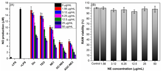 (A) Effect of Dic, TEO, and TEO-based NEs (NE1, OC-NE4, and AOC-NE3) at progressive concentrations of (0–50 μg/mL) on the nitric oxide formation in LPS-induced RAW 264.7 cells. (B) Changes in the RAW 264.7 cells viability after treatment by AOC-NE3 for 48 h.