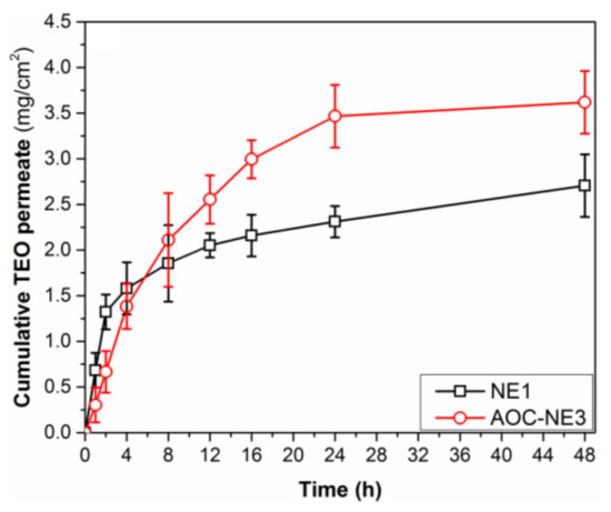 Skin permeability profile of TEO-based nanoformulations (NE1 and AOC-NE3) through a rat skin for 24 h.
