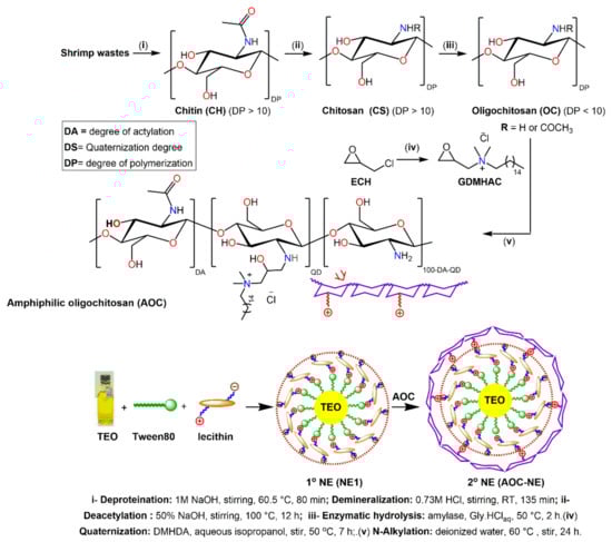 Schematic diagram for preparation of oligochitosan (OC), glycidyl N,N-dimethylhexadecyl ammonium chloride (GDMHAC), amphiphilic oligochitosan (AOC), and TEO-based NEs.