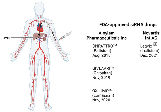 The use of RNA interference (RNAi), a natural biological phenomenon within cells for silencing genes, in the treatment of tumours and rare genetic disease has rapidly progressed in the past few years. The process involves small interfering RNAs (siRNAs), which are noncoding and double stranded, or similar molecules, such as microRNAs, that mediate gene silencing. The specificity of targeting by siRNA is advantageous for treating any disease that requires genetic regulation. However, delivery of siRNA therapeutics to target cells in the body is a major barrier. The abundance of RNases in tissues results in rapid degradation of exogenous RNA. The size and highly negative charge of RNA molecules makes their delivery across cell membranes difficult [1]. To circumvent this challenge, major advances have been made in the development of RNA delivery vehicles, including viral and non-viral delivery systems. The use of viral delivery systems, such as lentiviral vectors and adeno-associated viral vectors, has been successfully applied in the efficient systemic delivery of RNAs. However, unwanted immune responses to viral vectors hinder their wide application in clinic [2,3]. Integration of the lentiviral vector close to or within a coding region of the host genome may also result in undesirable effects such as loss of gene function or overexpression, stimulation of oncogenesis, or cell death [4]. Therefore, non-viral systems have attracted increasing attention for their potential safety and flexibility. Non-viral vectors, such as nanocarriers, have high gene-packaging capacity, can be designed to have low immunogenicity and are relatively simple and less costly to manufacture [5]. Currently, four RNAi therapeutics delivered by non-viral strategies have been approved by the FDA and EMA for delivering RNAi into livers in clinics. Patisiran, the first approved RNAi (in 2018) for the treatment of hereditary transthyretin-mediated amyloidosis (hTTR) [6], acts by targeting the untranslated region of TTR mRNA, reducing translation of its protein [7]. The lipid nanoparticle formulation directs it to the main TTR production site, which is the liver (Figure 1). The second approved RNAi drug, Givosiran, has the siRNA molecule conjugated to Alnylam’s Enhanced Stabilization Chemistry N-acetylgalactosamine (ESC-GalNAc) residues, which binds to specific receptors mainly found on hepatocytes [8]. It is used in the treatment of acute hepatic porphyria (AHP) and acts by degrading 5-aminolevulinic acid synthase 1 (ALAS1) mRNA, resulting in reduced levels of intermediates associated with AHP attacks. The third approved RNAi drug, Lumasiran, was developed for the treatment of Hyperoxaluria type 1 and, similar to Givosiran, is conjugated to ESC-GalNAc. It degrades glycolate oxidase mRNA, reducing hepatic production of oxalate [9]. Inclisiran, the most recently approved drug, targets mRNA coding for hepatic proprotein convertase subtilisin-kexin type 9 and utilises the GalNAc tail. It results in a reduction of low-density lipoprotein cholesterol and is used for the treatment of atherosclerotic cardiovascular disease [10].