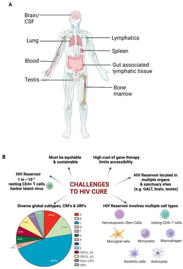 Challenges associated with HIV infection. (A) Illustration showing the distribution of organs and tissues known to harbour latent HIV (B) Challenges in attaining HIV cure. Created with BioRender.com.