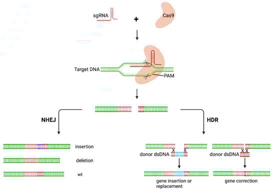 Mechanism of action of CRISPR-Cas9 gene editing. The CRISPR-Cas9 complex cleaves the target and creates a DSB. The DSB is then repaired via either the NHEJ or HDR pathway. The NHEJ pathway is error-prone, resulting in loss of gene function caused by indels in gene sequence. HDR results in precise modifications of the target. sgRNA, single guide RNA; PAM, protospacer-adjacent motif; NHEJ, nonhomologous end-joining; HDR, homology-directed repair; wt, wildtype. Created with BioRender.com.