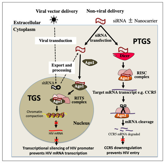 RNA therapeutics have been widely explored for HIV treatment, including siRNAs to maintain HIV permanently in a state of super latency (the block and lock approach), shRNAs targeting CCR5 mRNA, and CRISPR gRNA to excise the latent reservoirs. As mentioned above, there are two main RNA-induced gene-silencing pathways, PTGS and TGS.