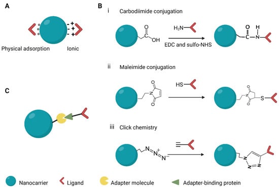 Methods used in conjugating ligands to nanocarriers. (A) Adsorption, (B) covalent conjugation, (C) use of adapters. EDC, 1-ethyl-3-(-3-dimethylaminopropyl) carbodiimide; sulfo-NHS, N-hydroxysulfosuccinimide. Created with BioRender.com.