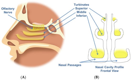 (A) Nasal cavity contains three turbinates that increase the surface area for warming and humidification of incoming air. Olfactory neurons innervate the superior nasal cavity. The turbinates and olfactory regions are nasal drug delivery targets. (B) The nasal passages are narrow and convoluted due to the turbinate structure. The complex structure and changing airflow through the nasal cavity may prevent deposition in the target area.