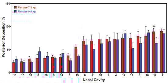 Posterior deposition in 20 nasal models sorted in ascending order. Two actuation forces were utilized. ** indicates significant difference in one model between the 5.8 and 7.2 kg actuation forces [].