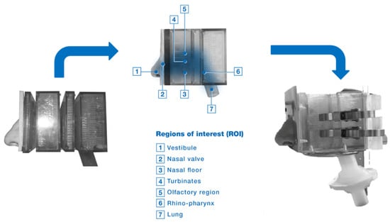 In order to study the distribution of the deposited aerosol in different regions of the nasal models [], disassemblable segmented models have been developed. Depending on the specificity needed, the nasal cast model can be divided into several anatomically relevant regions, or regions of interest (ROI). The areas of interest frequently studied are the following: nostrils, vestibule, turbinates, olfactory region and nasopharynx (Figure 4). The regions beyond the nasopharynx located at the back of the nasal casts can allow for the estimation of small inhalable particles, <10 µm, that may pass inadvertently to the lungs.