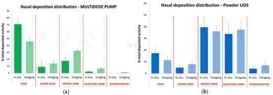 Percent deposition from a multi-dose aqueous nasal spray (a) and a unit dose (UDS) nasal powder (b). Deposition in the nasal cast trended with in vivo deposition as measured by gamma scintigraphy. (Dark green/Dark blue = in situ deposition with Fluorescein, Light green/Light blue = deposition by gamma scintigraphy).