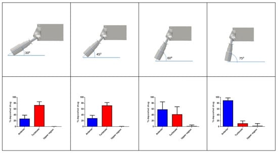 Percent nasal deposition after administration of 0.8% hypermellose cromolyn sodium nasal spray (n = 10). Deposition was evaluated after dosing using four different administration angles. The nasal cast was segmented to highlight deposition in three regions of the nose: anterior (blue), turbinate region (red), and upper region (grey) [].