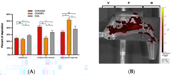 Intranasal deposition of three OVA antigen formulations in a nasal cast representative of a 7-year-old girl (A). The administration angle was 40° from the horizontal. Distribution (B) is shown in the vestibule (V), posterior region (P) and nasopharynx (N) from formulation OVA/AS04 [] (ns: not significant, * p < 0.05).