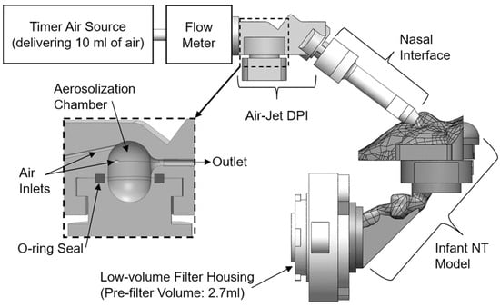 In vitro preterm infant nose throat (NT) model for evaluation of a novel in-line DPI. The inset shows an expanded view of the air-jet DPI, illustrating internal components, including the aerosolization chamber. NT, nose-throat [].