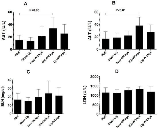Lip-WCAgs vaccine formulation was safe and did not induce any toxicity in mice. The (A) AST level, (p < 0.05) PBS vs. IFA-WCAgs, (B) ALT level, p < 0.01, PBS vs. IFA-WCAgs, (C) BUN level, and (D) LDH in immunized mice. The data are mean ± SD of three experiments.
