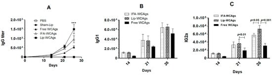 Mice immunized with Lip-WCAgs had higher levels of serum IgG and IgG2a. The levels of (A) IgG, *** (p < 0.001) Lip-WCAgs vs. IFA-WCAgs (B) IgG1, and (C) IgG2a on days 14, 21, and 28 post-immunization. The data are expressed as mean ± SD of three values.