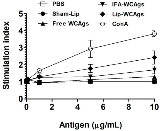 The splenocytes from mice immunized with Lip-WCAgs showed remarkably greater proliferation with a stimulation index of 2.43 ± 0.226 as compared to the stimulation indices of 1.3 ± 0.5 and 1.7 ± 0.13 of the splenocytes from Free WCAgs and IFA-WCAgs-immunized mice, respectively (Figure 3). The mice injected with Sham-lip or PBS did not show any increase in lymphocyte proliferation.