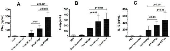 The secretion of IFN-γ, IL-4, and IL-12 was analyzed in the culture supernatant of splenocytes from mice immunized with Lip-WCAgs or Free WCAgs (Figure 4). The splenocytes from the mice immunized with Lip-WCAgs produced 286 ± 30 pg/mL of IFN-γ, whereas the mice immunized with IFA-WCAgs secreted 121 ± 19 pg/mL of IFN-γ (Figure 4A) (p < 0.001). Immunization with Free WCAgs was the least effective in inducing the secretion of IFN-γ as the splenocytes from the mice immunized with Free WCAgs produced 53 ± 16 pg/mL of IFN-γ. In addition, the production of IL-4 was analyzed in the culture supernatant of the splenocytes. The splenocytes from the mice immunized with Lip-WCAgs produced 319 ± 45 pg/mL of IL-4 (Figure 4B). The splenocytes from the mice immunized with IFA-WCAgs secreted IL-4 levels of 276 ±45 pg/mL, whereas Free WCAgs produced 154 ± 31 pg/mL of IL-4 (Figure 4B). The level of IL-12 was also quantified in the culture supernatants of the splenocytes from Free WCAgs or IFA-WCAgs or Lip-WCAgs-immunized mice (Figure 4C). The culture supernatant from the splenocytes from Lip-WCAgs-immunized mice had an IL-12 level of 488 ± 88 pg/mL, which was significantly higher than the 334 ± 44 pg/mL of IL-12 secreted by the splenocytes from IFA-WCAgs-immunized mice (p < 0.05). However, the secretion of IL-12 was found to be 187 ± 51 pg/mL by the splenocytes from the mice immunized with Free WCAgs (Figure 4C). The splenocytes from the mice injected with PBS or Sham-Lip produced insignificant amounts of IL-12.