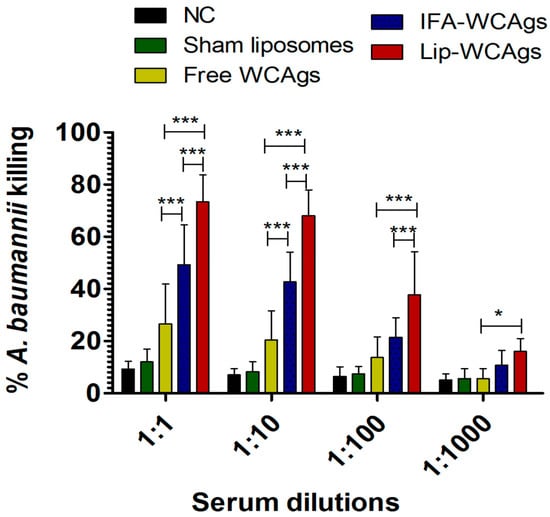 The opsonophagocytic activity of antisera from the immunized mice was analyzed against A. baumannii. The findings showed that antiserum from Lip-WCAgs-immunized mice showed the highest bactericidal activity in the presence of macrophages. At a dilution of 1:1, antiserum from Lip-WCAgs-immunized mice demonstrated 73.3 ± 5.7% killing which was significantly greater than the 49 ± 12.3% killing in the presence of antiserum from IFA-WCAgs-immunized mice (Figure 5) (p < 0.001). Antiserum from the mice immunized with Free WCAgs showed only 26.7 ± 6.1% killing of A. baumannii at the same dilution (Figure 5). Interestingly, the antiserum from Lip-WCAgs-immunized mice showed greater opsonophagocytic killing at the dilutions of 1:10 and 1:100 (Figure 5).