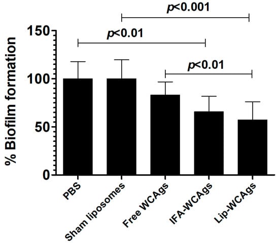We tested the efficacy of the antisera against the formation of biofilm by A. baumannii (Figure 6). The treatment with antisera from the mice immunized with Lip-WCAgs reduced the biofilm formation to 57% as compared to that in the presence of antisera from Sham-Lip injected mice (Figure 6) (p < 0.001). Whereas, the biofilm formation in the presence of the antisera from the mice immunized with IFA-WCAgs was reduced to 66% (Figure 6) (p < 0.01). However, the biofilm formation in the presence of antisera from the mice immunized with Free WCAgs was marginally reduced to 83%.