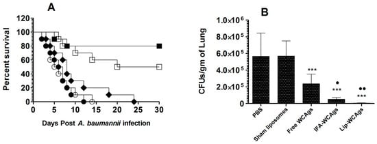 We assessed the prophylactic efficacy of vaccine formulations against A. baumannii infection in a mouse model. Immunization with Lip-WCAgs was highly effective and the immunized mice showed an 80% survival rate on day 30 post-A. baumannii infection (Figure 7A). Whereas, the mice in the IFA-WCAgs group had a 50% survival rate. All the mice immunized with Free WCAgs died within 30 days post-A. baumannii infection. The data showed that immunization with Lip-WCAgs and IFA-WCAgs significantly increased the survival rate as compared to the immunization with Free WCAgs (p = 0.0004 and p = 0.0006).