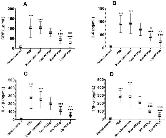 Lip-WCAgs-immunized mice showed the lowest level of CRP, IL-6, IL-1β and TNF-α in the systemic circulation. (A) CRP. *** (p < 0.001) normal control vs. PBS or Sham liposomes, ●●● (p < 0.001) PBS vs. IFA-WCAgs or Lip-WCAgs, × (p < 0.05) Free WCAgs vs. IFA-WCAgs, ×× (p < 0.01) Free WCAgs vs. Lip-WCAgs. (B) IL-6. *** (p < 0.001) normal control vs. PBS or Sham liposomes, ●●● (p < 0.001) PBS vs. IFA-WCAgs or Lip-WCAgs, × (p < 0.05) Free WCAgs vs. IFA-WCAgs, ×× (p < 0.01) Free WCAgs vs. Lip-WCAgs. (C) IL-1β. *** (p < 0.001) normal control vs. PBS or Sham liposomes, ●●● (p < 0.001) PBS vs. IFA-WCAgs or Lip-WCAgs, ×× (p < 0.01) Free WCAgs vs. Lip-WCAgs. (D) TNF-α. *** (p < 0.001) normal control vs. PBS or Sham liposomes, ●●● (p < 0.001) PBS vs. IFA-WCAgs or Lip-WCAgs, ×× (p < 0.05) Free WCAgs vs. IFA-WCAgs, ××× (p < 0.01) Free WCAgs vs. Lip-WCAgs.