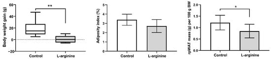 Body weight gain, adiposity index (the approximate index of intra-abdominal fat mass and cardiovascular risk), and relative rpWAT mass of l-arginine-treated animals and controls are presented in Figure 2. The treatment triggered a reduction in body weight gain (p < 0.01), which is associated with the lower relative mass of rpWAT (p < 0.05). Adiposity index was also determined following a 7-day l-arginine treatment and showed a reducing trend that did not reach statistical significance (p = 0.07).