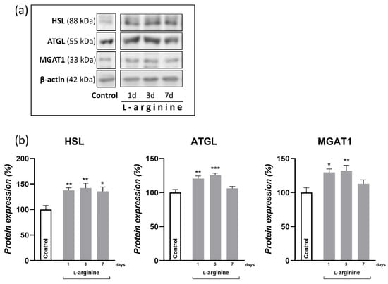 The relative mass of WAT is mainly determined by its lipid reserves. Namely, most of the adipocyte cell volume is occupied by triacylglycerols that are stored and mobilized via triacylglycerol synthesis and hydrolysis, respectively. Here, the expression levels of key enzymes involved in both processes are presented in Figure 3. Note that 1-day and 3-day l-arginine treatments increased the expression levels of hormone-sensitive lipase (HSL) and adipocyte triacylglycerol lipase (ATGL), in parallel with monoacylglycerol O-acyltransferase 1 (MGAT1). Following a 7-day long treatment, however, only HSL remained increased compared to the untreated control (p < 0.05).