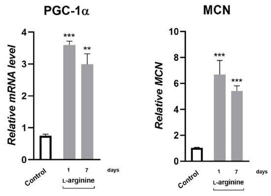 Peroxisome proliferator-activated receptor-gamma coactivator—1α (PGC-1α) gene expression and mitochondrial DNA copy number (MCN) level increase in retroperitoneal white adipose tissue (rpWAT) upon 1 and 7 days of 2.25% l-arginine∙HCl treatment. * Comparison with control (n = 6 per group); ** p < 0.01, *** p < 0.001.
