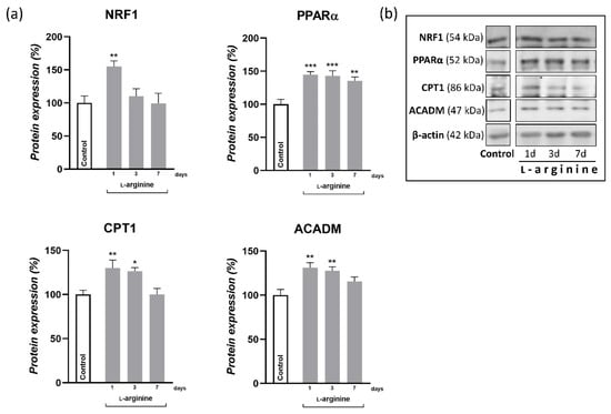 Protein content of nuclear respiratory factor 1 (NRF1), peroxisome proliferator-activated receptor-α (PPARα), carnitine palmitoyltransferase 1 (CPT1), and acyl-CoA dehydrogenase medium chain (ACADM) in retroperitoneal white adipose tissue (rpWAT) of rats receiving either drinking water or 2.25% l-arginine∙HCl in drinking water for 1, 3, and 7 days. Data obtained after quantification of specific bands and expressed as % of the control group taken as 100% represent the mean ± SEM (a). Each band is representative of six pooled samples per group (b). Experiments were repeated in triplicate. Data were quantified as described in the Methods. * Comparison between control and l-arginine-treated group; * p < 0.05, ** p < 0.01, *** p < 0.001.