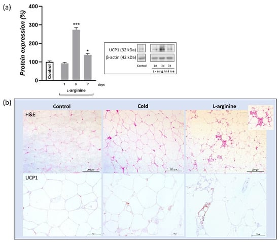 UCP1 protein expression level and tissue expression pattern in control, cold-exposed, and l-arginine-treated rats. Analysis of UCP1 protein expression after 1, 3, and 7 days of l-arginine treatment (a). Maximum induction of UCP1 was observed on day 3 of l-arginine treatment. Protein content is expressed relative to control rats (100%). Data represent the mean ± SEM. * Compared to control, * p < 0.05, *** p < 0.001. Experiments were repeated in triplicate. Data were quantified as described in the Methods. Analysis on the morphological level (H&E) indicates the simultaneous appearance of sporadic islets of multilocular cells selectively in retroperitoneal white adipose tissue (rpWAT) of l-arginine-treated rats (b). Inset, enlarged area of multilocular cells. Scale bars, 200 μm. Immunohistochemical staining for UCP1 (b, lower panel) showed that, compared with very weak UCP1-immunopositive adipocytes in the control, stronger UCP1-immunopositivity characterized adipocytes in rpWAT of rats exposed to cold and treated with l-arginine for 3 days. Moreover, highly positive UCP1-positive multilocular adipocytes appear only in the l-arginine-treated group of rats. Scale bars, 50 μm.