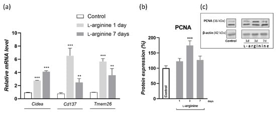 To dissect the cellular basis of l-arginine-induced WAT browning, we investigated gene expression of thermogenic adipocytes marker (Cidea) and the more specific markers of beige adipocytes (Cd137 and Tmem26) in rpWAT of l-arginine-treated animals and controls (Figure 7). After twenty-four hours of l-arginine treatment, gene expression levels of thermogenic and beige adipocyte markers, Cidea, Cd137, and Tmem26 were all increased, and these levels were maintained until the end of the 7-day l-arginine treatment (Figure 7a). In parallel, protein expression of proliferation marker proliferating cell nuclear antigen (PCNA) increased on day 3 of l-arginine treatment (p < 0.001) (Figure 7b).