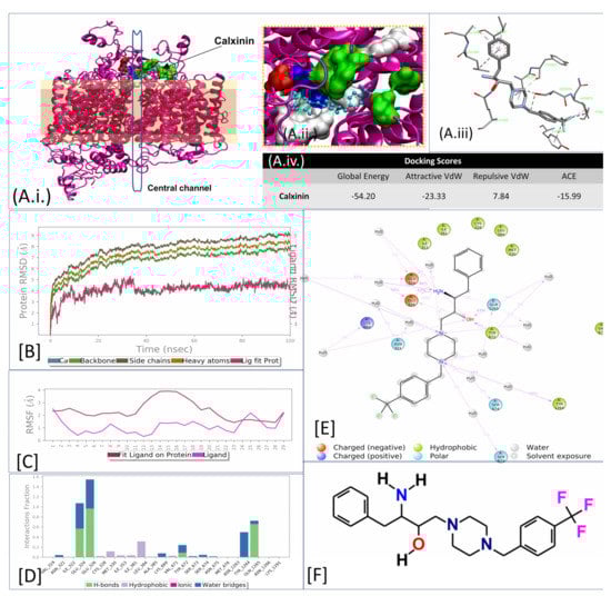 (A) Schematic representations of Calxinin docked at the active site (i) Active site amino acid molecular 3D topological positions and relative position of the central channel pore. Color and representation scheme: The protein backbone is mauve and in ribbon cartoon. (ii) Zoom-in view of binding pocket with docked ligands. Calxinin binding site is represented by amino acid side chain residues in surface structure colored by type (white: hydrophobic, green: polar, red: -ve, and blue: +ve charged), (i,ii). Calxinin is represented by CPK in sky blue color. Dashed lines show the blown-up frame of the docking site. (iii) Licorice styled wireframe model to show 3D interacting side-chain amino acid residues and interaction type. (iv) Initial docking scores table with global energy, attractive and repulsive Vanderwall forces, and atomic contact energy (ACE). (B) A 100 ns MD simulation data analysis for Calxinin. RMSD of the protein backbone/ligand position relative to the initial structure throughout 100 ns MD simulations. (C) Ligand vs. binding site movements during the simulation. (D) Graphical representation of the percentage of protein-ligand contacted and their biochemical nature throughout the MD simulation. (E) Two-dimensional interaction map and interaction biochemical characteristics most conserved during the simulation. The phenyl trifluoride group seems not to interact due to changes in its binding site during simulations lowering the percent interaction of the interacting pocket. (F) Two-dimensional structure of Calxinin, ((2S,3S)-3-amino-4-phenyl-1-(4-(4-(trifluoromethyl)benzyl)piperazin-1-yl)butan-2-ol).