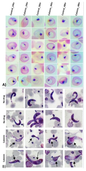 Aliquots (100 µL) of cultures containing gametocytes at the indicated stages (preferably stage I) were transferred to a 96-well plate in duplicate as described previously []. The plate was incubated in a 37 °C incubator maintained with 5% CO2. The culture medium was changed after 48 h and the appropriate concentration of Calxinin was maintained. Blood smears of parasites were fixed with methanol and stained with Giemsa (Amresco, Cleveland, OH, USA). Slides were observed and parasitemia was monitored with a light microscope equipped with a 100× apochromatic objective lens. The images were captured by a 10-megapixel digital microscope camera for enumerating the efficacy of Calxinin.