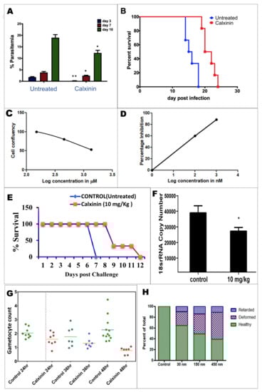 After the injection of sporozoites by mosquitoes into the human bloodstream, the liver schizonts are the first stage of human infection. The activity of candidate drug compounds against these liver stages is considered an important part of antimalarial therapy known as chemoprotection. To evaluate the efficacy of Calxinin against liver-stage parasites, we infected cultured HepG2 cells with Pb sporozoites previously harvested from mosquito salivary glands. Infected HepG2 cells were treated with Calxinin (0.1, 1, and 10 μM) dissolved in 1% DMSO. Subsequently, the parasite load was quantified by qPCR in the control and Calxinin-treated cells using parasite-specific 18S rRNA primers. Approximately 60% and 88% reduction of the parasite load was observed in cells treated with 0.1 µM and 1 µM of Calxinin, respectively. IC50 values were determined to be 79 nM (Figure 3C,D). We treated the infected mice with a fixed dose of 10 mg/kg of Calxinin for three days. Pb liver-stage parasites matured into liver schizonts within ~ 55 h. The parasite load was quantified by qPCR and we observed 30 % inhibition at a given dose of 10 mg/kg Calxinin (Figure 3F). Notably, the liver stage potency of Calxinin was much higher than that of atovaquone (ATQ) in the culture []. Next, we investigated the liver stage activity of Calxinin in the mouse model by infecting mice via mosquito bites). We recorded a single-day delay in the survival of Calxinin-treated mice over the untreated controls. The gain in survival time was notably less (Figure 3E) when compared to the gain observed for the blood stage infection (Figure 3B). This may be because infection with sporozoites leads to a dramatic parasite amplification event in liver cells.