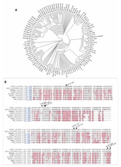 - Dereeper, A.; Guignon, V.; Blanc, G.; Audic, S.; Buffet, S.; Chevenet, F.; Dufayard, J.-F.; Guindon, S.; Lefort, V.; Lescot, M.; et al. Phylogeny. Fr: Robust Phylogenetic Analysis for the Non-Specialist. Nucleic Acids Res. 2008, 36, W465–W469. [Google Scholar] [CrossRef]