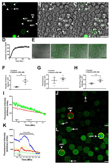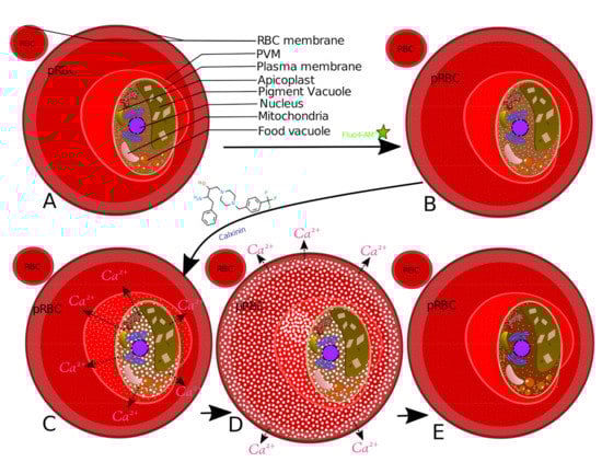 - Zipprer, E.M.; Neggers, M.; Kushwaha, A.; Rayavara, K.; Desai, S.A. A Kinetic Fluorescence Assay Reveals Unusual Features of Ca++ Uptake in Plasmodium Falciparum-Infected Erythrocytes. Malar. J. 2014, 13, 184. [Google Scholar] [CrossRef]