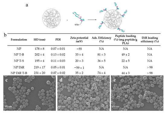 Physicochemical characteristics and morphology of peptide formulations based on PLA particles. (a) The Tat-Beclin (T-B) peptide or Tat-Scrambled (T-S) control peptide was adsorbed on biodegradable particles (NP) or fluorescent particles (NP DiR), made of poly(L-Lactide)/Poly(D-Lactide). (b) Hydrodynamic diameter (HD) (Z-average), polydispersity index (PDI), zeta potential, adsorption efficiency, peptide loading and DiR encapsulation efficiency of the prepared formulations. Values are means ± SD of three measurements pooled from at least three independent experiments. SEM micrographs of plain particles (NP) (c), Tat-Beclin particles (NP T-B) (d) and Tat-Scrambled peptide control particles (NP T-S) (e). Scale bar: 300 nm.
