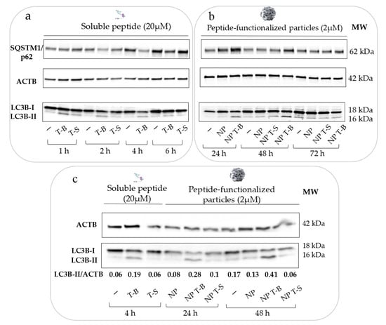 We then set out to compare the autophagy modulatory effect of the T-B peptide and NP T-B at their peaks of activity: after 4 h of stimulation for the peptide and 24 or 48 h for the NP T-B. As seen in the blot (Figure 2c), treatment with T-B and NP T-B but not T-S, NP or NP T-S resulted in conversion of LC3-I to LC3-II. The ratio of LC3-II/ACTB was higher for NP T-B at 24 and 48 h (0.28 and 0.41, respectively) compared to T-B for 4 h (0.19), suggesting an enhanced effect on autophagy for the formulated peptide. It is worth noting that the concentration of the peptide formulated with particles was 2 µM, ten times lower compared to the concentration of the soluble peptide. Importantly, this ten times lower dose of the T-B peptide formulated with particles was associated with a greater enhancement of LC3-II accumulation compared to the soluble peptide.