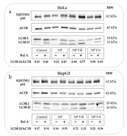 Evaluation of autophagic flux in (a) HeLa and (b) HepG2 cells treated with particle formulations. Cells were treated with NP T-B (2 µM) or NP T-S (2 µM) or NP for 24 h and bafilomycin A (50 nM) was added at the last 2 h of co-incubation. The LC3B-II/ACTB ratio was quantified in the blots. An increase in LC3B-II/ACTB in the presence of NP T-B and Baf A (NP T-B+) compared to Baf A treatment alone (Control+) denotes that NP T-B are original autophagy inducers. Both blots are representative of at least three independent experiments.