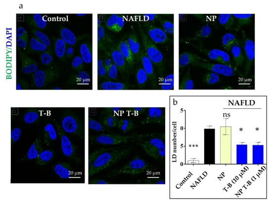 HeLa cells were seeded at 15,000–20,000 cells/well on chambered slides (Ibidi, Gräfelfing, Germany, 81201). To establish the in vitro cell model of steatosis, cells were incubated with a combination of oleic (Sigma Aldrich, Saint-Quentin-Fallavier, France, O1008) and palmitic acid (Sigma Aldrich, Saint-Quentin-Fallavier, France, P0500) (OA/PA 0.8 mM/0.4 mM) for 24 h. Fatty acids were withdrawn, the medium renewed and the cells were then treated with T-B or NP T-B and NP for another 16 h. T-B was used at 10 µM and NP T-B at a concentration of 1 µM. Cells were then washed and fixed with 4% paraformaldehyde (w/v) in PBS for 15–20 min at room temperature. Cells were then stained with BODIPY (493/503) (Invitrogen, Fisher Scientific, Illkirch-Graffenstaden, France, D3922) (4 µg/mL) and DAPI (Sigma Aldrich, Saint-Quentin-Fallavier, France, D9542) (2 µg/mL) for 20–30 min. Slides were mounted using a few drops of Vectashield mounting medium (Vector Laboratories, Newark, CA, USA, H-1400) on coverslips. Samples were allowed to cure overnight in the dark at 4 °C and then imaged in a confocal microscope, Nikon LSM710 (PLATIM, Lyon, France). Number of lipid droplets was quantified with ImageJ 1.46r (National Institutes of Health, Bethesda, ML, USA) and Icy software (Institute Pasteur and France Bioimaging group, France). LDs were counted in at least 250–300 cells per condition. In ImageJ, a Triangle threshold was applied, and LDs were quantified using the Analyzing particles tool (size (μm2): 0.2 to infinity and circularity 0.2–1). In ICY, Scale 2 and sensitivity 20 were selected as the best settings in the Spot detection tool.