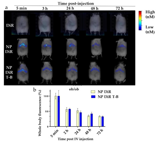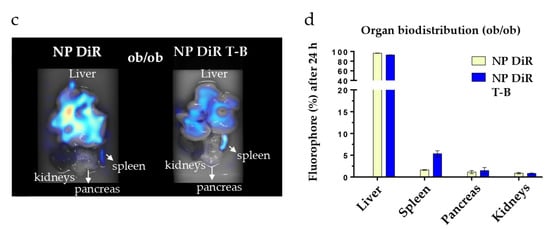 For the ex vivo organ biodistribution studies, SKH1 or ob/ob mice were injected with soluble fluorophore (DiR), NP DiR or NP DiR T-B, sacrificed after 24 h, and major organs (liver, spleen, pancreas, kidneys) were collected and imaged in the FMT4000.