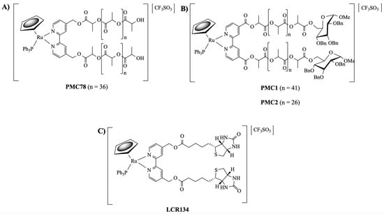 2.1.3. General Procedure for the Synthesis of [Ru(CpR)(P(C6H4R’)3)(2,2′-Bipyridine-4,4′-PLA-Biotin][CF3SO3] R = H; R’ = H (1) or R = H; R’ = F (2) or R = H; R’ = OCH3 (3) or R = CH3; R’ = H (4)