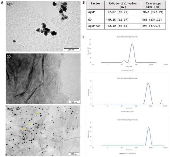 The characterization of the experimental factors. (A) The transmission electron microscopy (TEM) visualization of the AgNP, GO, and AgNP-GO complex. Examples of AgNP adhesion places are marked by yellow arrows. (B) Zeta potentials and Z-average size by dynamic light scattering analysis of the evaluated nanomaterials. (C) Size distributions of the analyzed hydrocolloids in water.
