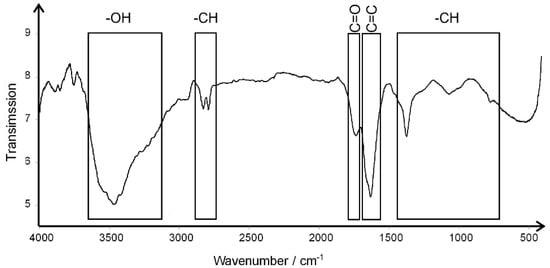 Additionally, the FTIR spectra of the AgNP-GO complex are presented in Figure 2. We can observe the presence of a 3442 cm−1 broad band associated with -OH groups. The 2810 cm−1 and 2768 cm−1 bands indicate CH groups. The 1720 cm−1 band in the spectrum is related to the C=O group. A band of 1619 cm−1 indicates the groups C=C, derived from GO. Bands found at 1359 cm−1 and 1054 cm−1 are associated with the CH groups.