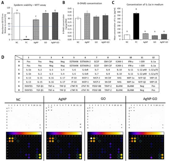 Biocompatibility of nanomaterials with Epiderm™. NC—negative control (DPBS), PC—positive control (5% SDS), AgNP—silver nanoparticles, GO—graphene oxide, AgNP-GO—complex. (A) EpiDerm™ viability measured by mitochondrial activity depletion. The MTT assay was performed 48 h after nanofactor treatments. The blue line represents the critical point at the level of 50%, below which the factor is recognized as an irritant. (B) The expression level of the oxidative DNA damage marker, 8-hydroxy-2’-deoxyguanosine (8-OHdG), in tissue as evaluated by enzyme-linked immunosorbent assays (ELISA). (C) The concentration level of the IL-1α released from Epiderm™ to the medium 24 h after experimental factor treatments, evaluated by a colorimetric ELISA test. The highest response was observed in the positive control (PC) group, which proves the functionality of the system. (D) Effect on the protein expression of proinflammatory cytokines in EpiDerm™ 24 h after treatment. The table represents a scheme of the protein pattern at the membrane. The results are normalized to the negative control (NC) group. Images were created with ImageJ software. The error bars represent standard error of mean (n = 4 per group). Different letters (A–C) above the columns indicate statistically significant differences (p ≤ 0.01) analyzed by Tukey’s HSD test.