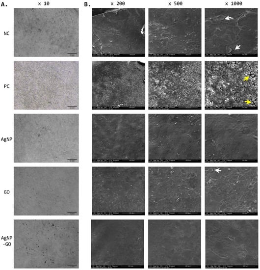 Visualization of EpiDerm™ surface 24 h after treatment. Comparison of silver nanoparticles (AgNP), graphene oxide (GO), and AgNP-GO complex activity to the negative control (NC, DPBS) and positive control (PC, SDS). (A) Digital photos of EpiDerm™ without fixation were obtained using a stereo microscope. (B) Tissues imaged in a scanning electron microscope were fixed in 2.5% l-glutaraldehyde in PBS. White arrows indicate the places of exfoliation and keratinization of the top layer; yellow arrows indicate a disruption of the continuity of the tissue surface.