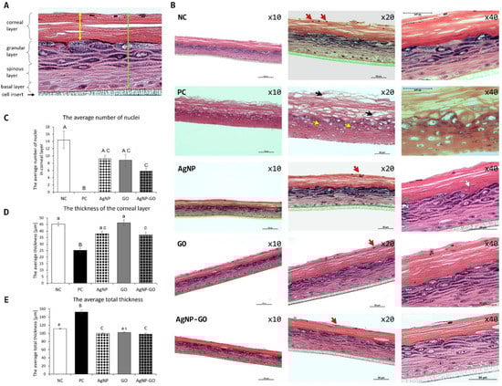 The EpiDerm™ morphology evaluated by optical microscopy after hematoxylin-eosin cross section staining. (A) Scheme of the EpiDerm™ structure. The double headed arrows indicate the boundaries of the measurement for the thickness of the corneal layer (yellow) and total thickness (green). (B) Visualization of the tissues after treatment at 10×, 20×, and 40× magnifications. Red arrows indicate the nuclei, black arrows indicate tissue damaged after SDS treatment, yellow arrows show the necrosis process, and the white arrow shows a place with local thickening of the stratum corneum. (C) The average number of nuclei in stratum corneum. (D) The average thickness of stratum corneum. (E) The average total thickness. Different letters (a, c) and (A–C) above the columns indicate statistically significant differences (p ≤ 0.05 and p ≤ 0.01 respectively) as analyzed by Tukey’s HSD test. NC—negative control, PC—positive control, AgNP—silver nanoparticles, GO—graphene oxide, AgNP-GO—complex of silver nanoparticles and graphene oxide.