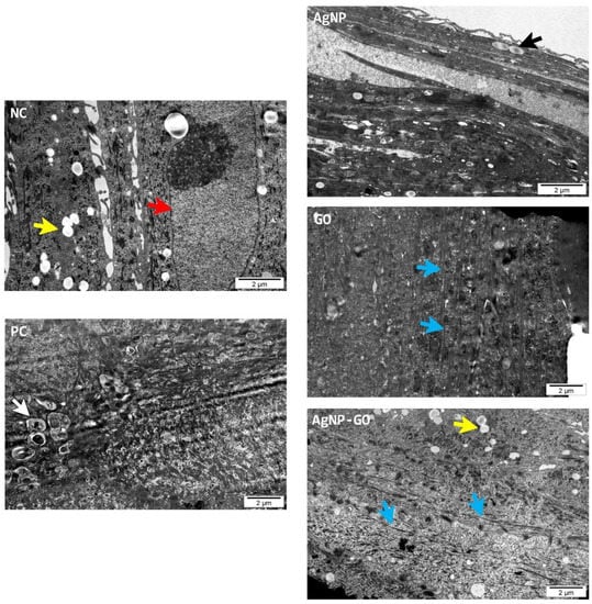 A detailed observation of EpiDerm™ with TEM showed no pathological changes between groups in the ultrastructure (Figure 6). The investigation was mainly concerned with the cell layers and their specific structures. We did not observe any nanoparticles inside the cells after AgNP and AgNP-GO treatment. The most compact cell layers, with visible strong keratin fibers (blue arrows) and the presence of multiple lipid droplets (yellow arrows), were observed in the samples from the AgNP-GO group.