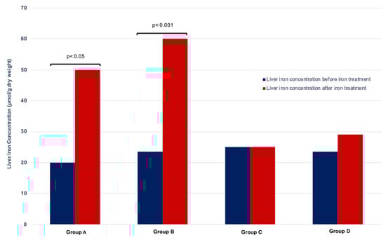 LIC was similar in the four groups of patients before iron therapy (p = 0.531, Kruskal–Wallis test). Overall, after their cycle of IV iron therapy, 23/54 patients (42.6%) had abnormal LIC; seven in group A, thirteen in group B, two in group C, and one in group D. The increase in the number of patients with abnormal LIC under iron therapy was only observed in group A (from one to seven patients) and in group B (from two to thirteen patients). LIC after IV iron therapy increased significantly in group A (iron sucrose 1.2 g; p = 0.001, Wilcoxon test) and group B (iron sucrose 2.4 g; p = 0.0001, Wilcoxon test) whereas there was no significant difference in LIC in group C (ferric carboxymaltose) or group D (iron isomaltoside) (p > 0.05, Wilcoxon test) (Table 2 and Figure 1).