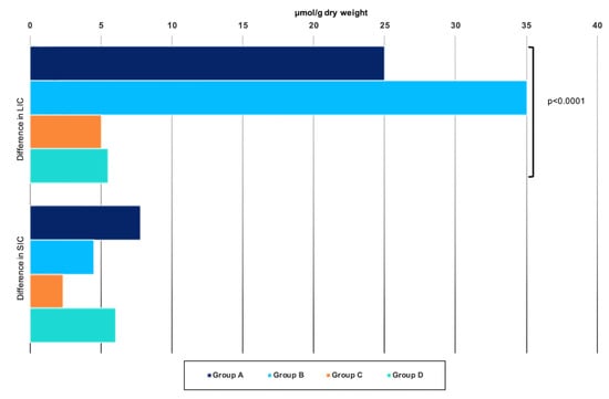 SIC by qMRI was similar before iron therapy in the four groups of patients (p = 0.799, Kruskal–Wallis test). The increase in SIC after iron therapy was less than the increase in LIC and only concerned patients in groups A and D (Table 2 and Figure 3). Similarly, the absolute difference in SIC (measured as SIC after iron therapy minus SIC before IV iron) was smaller in magnitude than that observed for LIC (Table 2 and Figure 2).