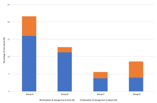 The percentage of iron perfused and sequestered in the reticuloendothelial system (e.g., liver plus spleen) differed significantly between iron sucrose 1.2 g and third-generation irons (infusions of 1 g): this increased to 21.6% in group A (iron sucrose 1.2 g) compared with 5.6% in group C (ferric carboxymaltose 1 g), and 8.6% in group D (iron isomaltoside 1 g) (p = 0.0012, Chi2 test) (Figure 4). The main driver of this phenomenon was liver iron storage (p = 0.0015, Chi2 test), but not splenic iron storage (p = 0.352, Chi2 test) (Figure 4). Of note, the percentage of iron perfused and sequestered in the reticuloendothelial system for group B (2.4 g of iron sucrose infused over 6 months) reached 12.7% (Figure 4).